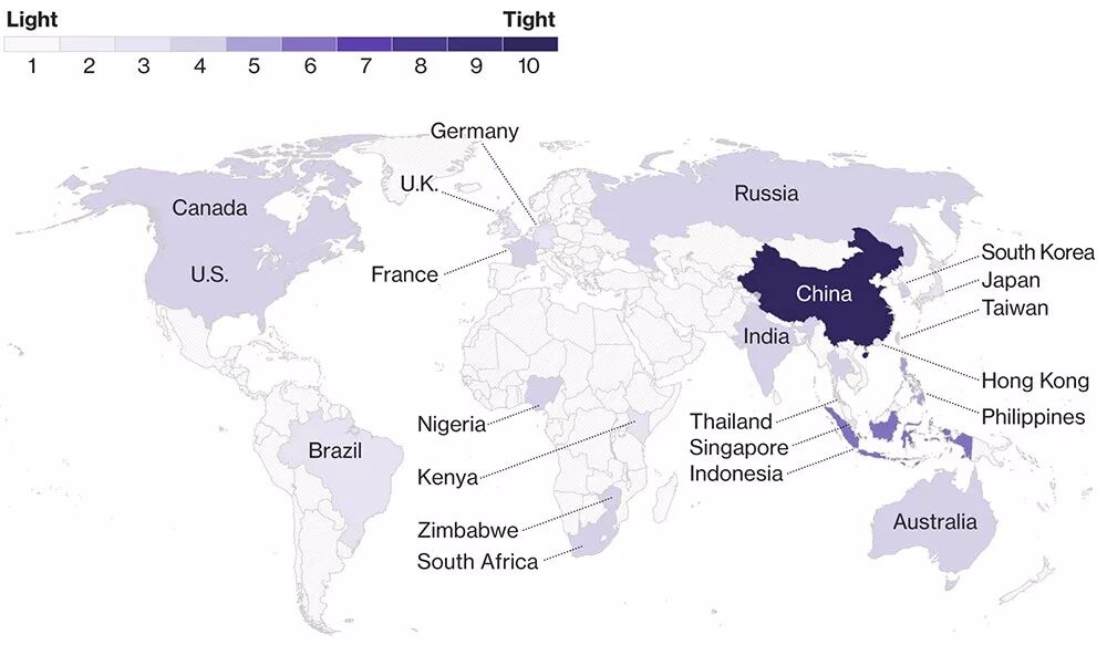 据彭博的数据,依全球范围内对加密货币相关政策管控程度,颜色越深,程度越重