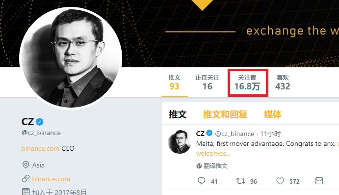 2018年5月14日,CZ赵长鹏的推特关注人数已经达到了16.8万,比国内当红的跑男、肯德基代言人鹿晗,还要多出两万多人。短短半年,他已经跃升为全球区块链和加密货币界最知名的华人了。