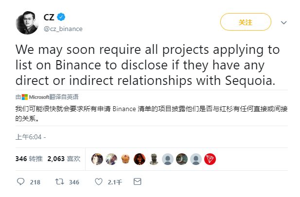 而最近,在推特发表的与红杉相关的表态,更把赵长鹏推到了变局者的位置,他写道:“我们可能很快会要求所有申请上币安的项目,披露他们是否与红杉有直接或间接的关系。” 一时间外界哗然,还有媒体解读为币安要下架红杉相关项目了。当然,后来何一在微博里补充声明只是“需要披露”而已,把气势软化了。